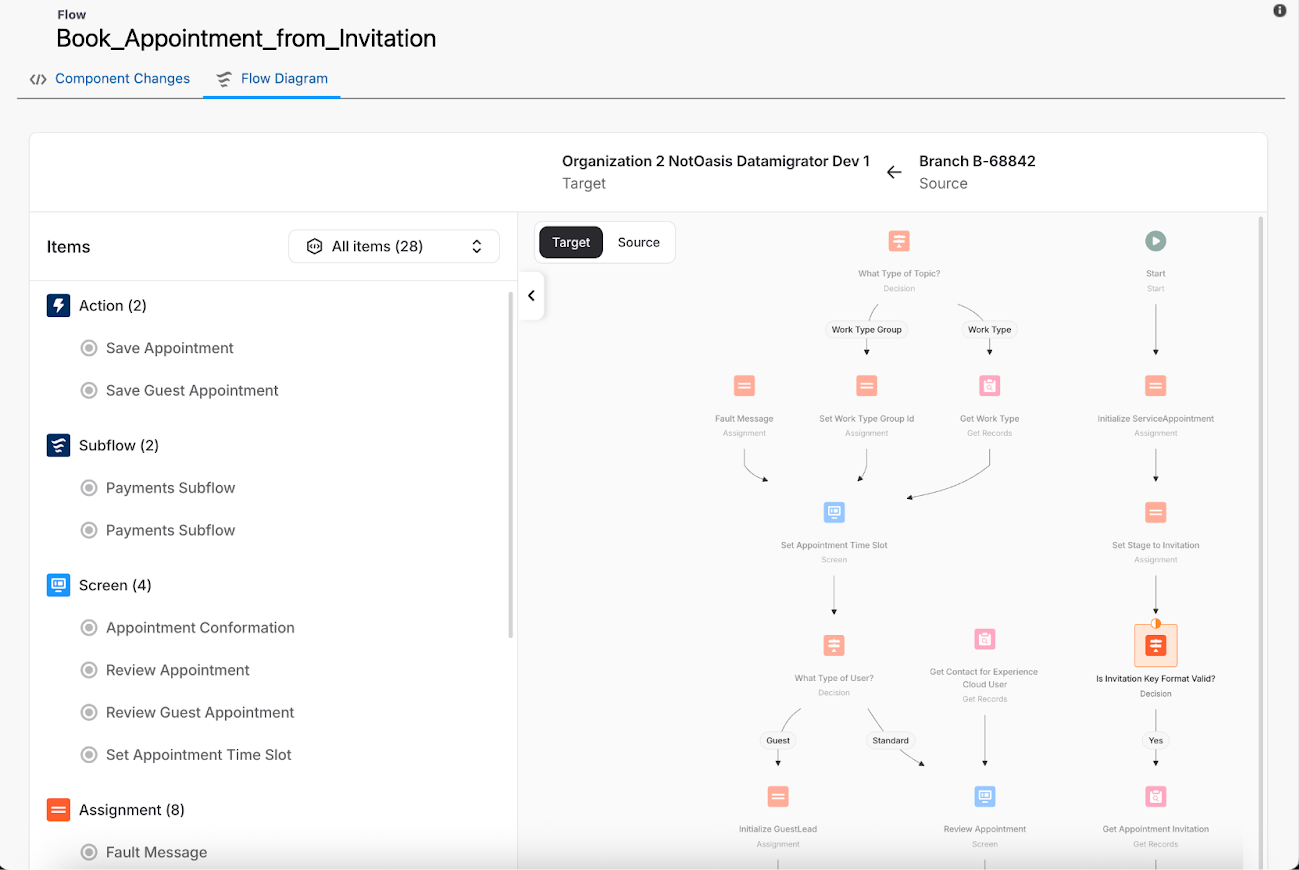 Flow Navigator is deeply integrated into the Flosum deployment process. Before deployment, it automatically compares the source Flow with the version in the target org, giving teams a final validation step before anything goes live.